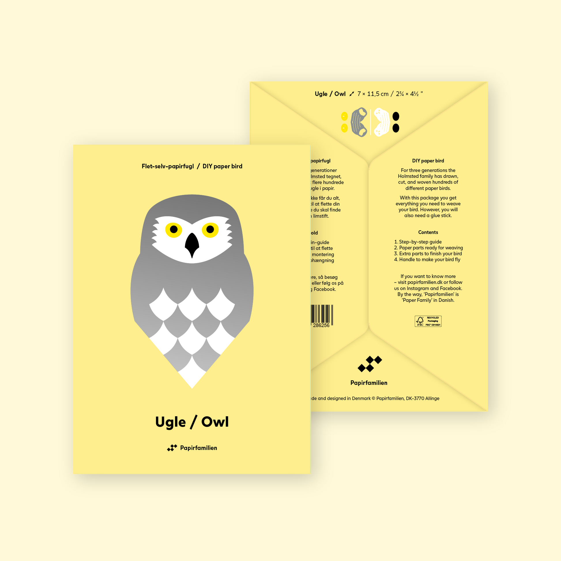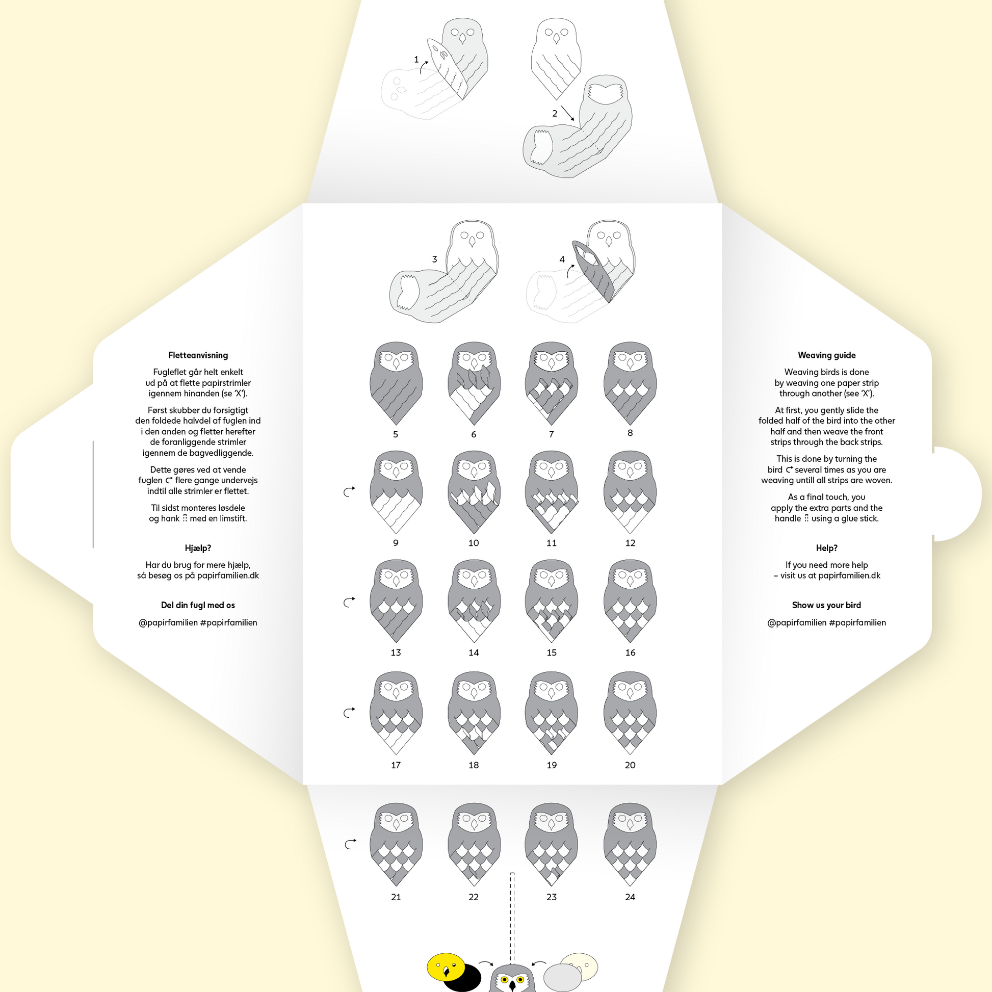 With this package you get everything you need to weave your bird. However, you will also need a gluestick. The package include a step-by-step guide, paper parts ready for weaving, extra parts to finish your bird and a handle to make your bird fly.