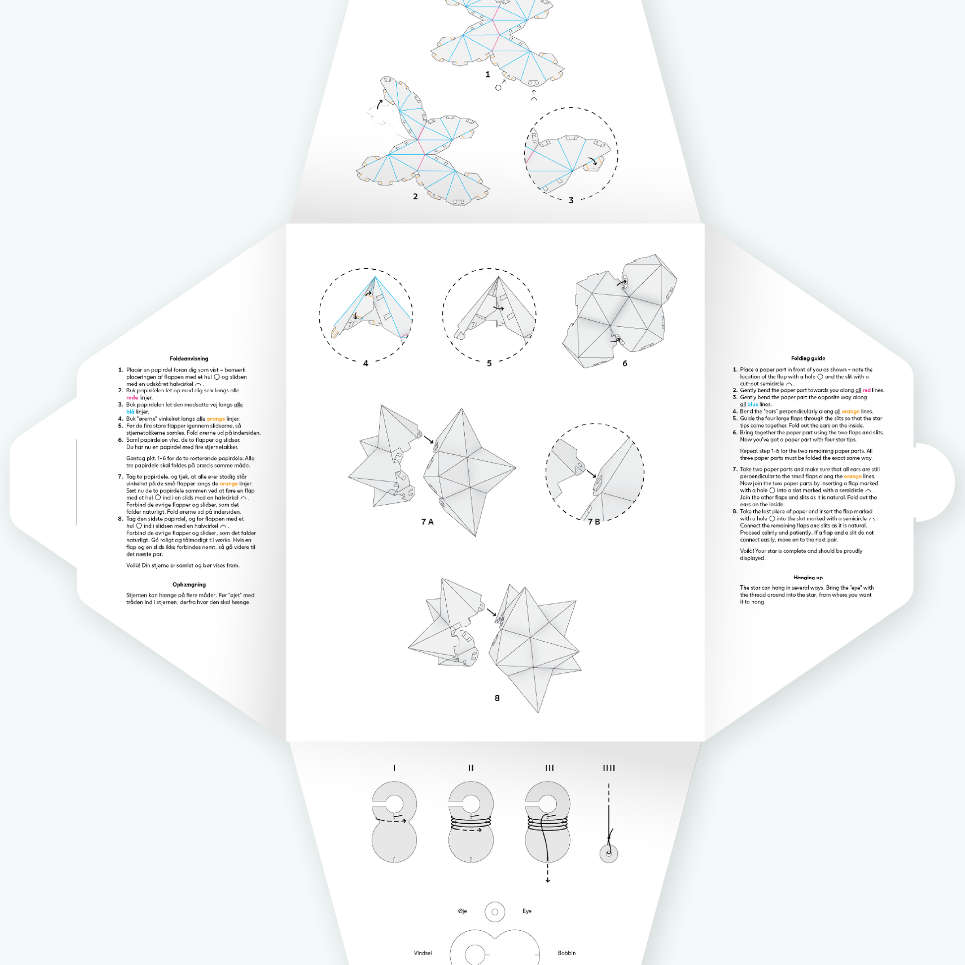 With this package, you get everything you need to fold your star. The package contains paper parts ready for folding, a step-by-step guide, a bobbin suspension, and a thread.