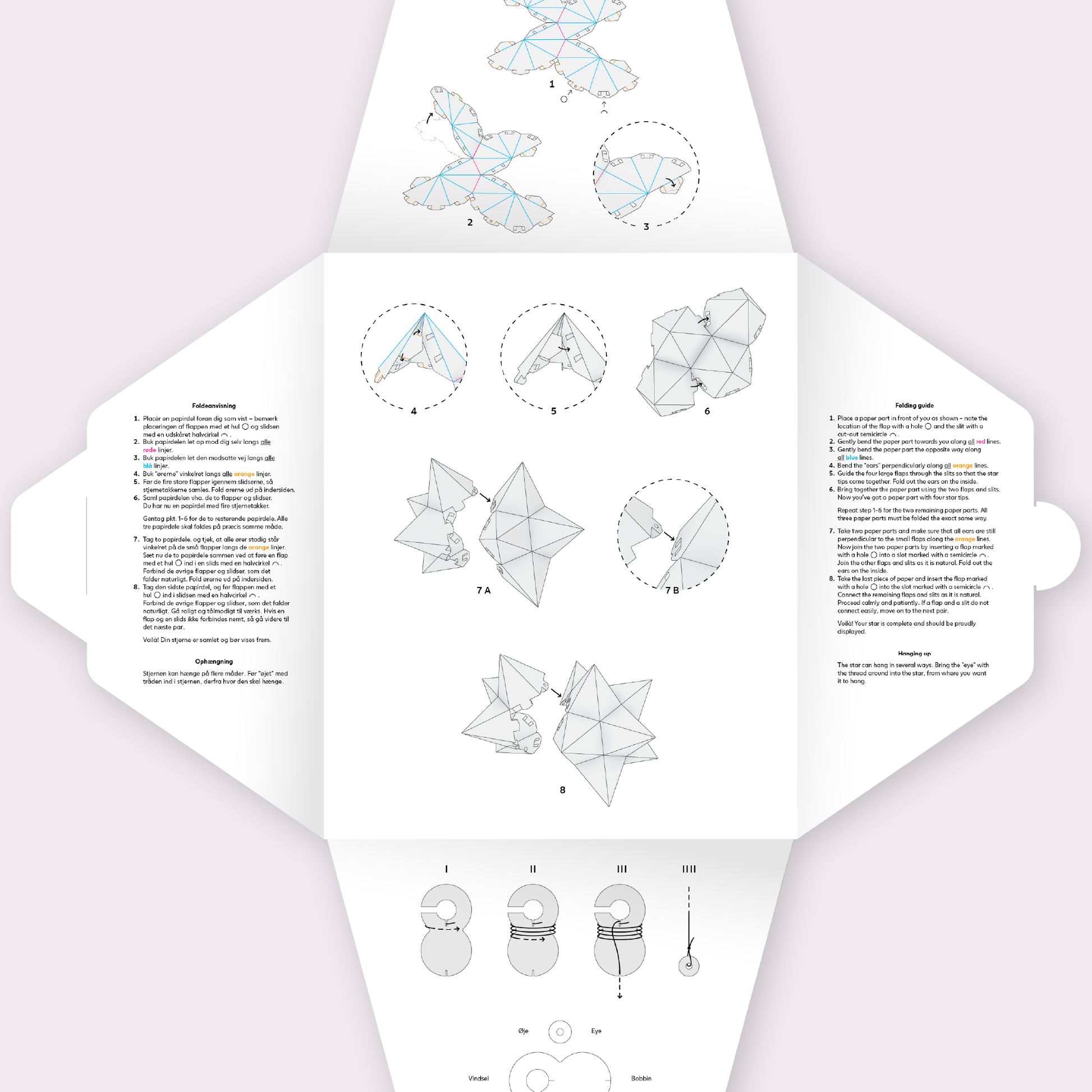 With this package, you get everything you need to fold your star. The package contains paper parts ready for folding, a step-by-step guide, a bobbin suspension, and a thread.