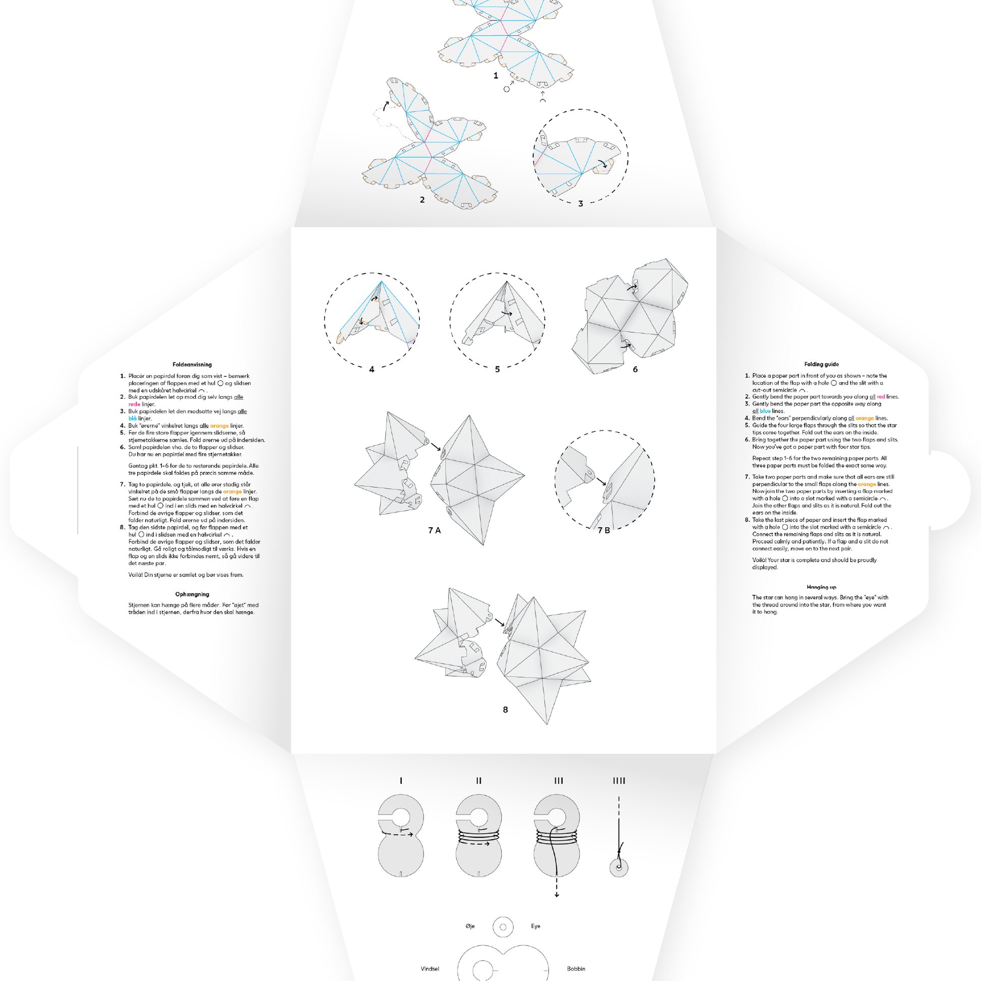 With this package, you get everything you need to fold your star. The package contains paper parts ready for folding, a step-by-step guide, a bobbin suspension, and a thread.