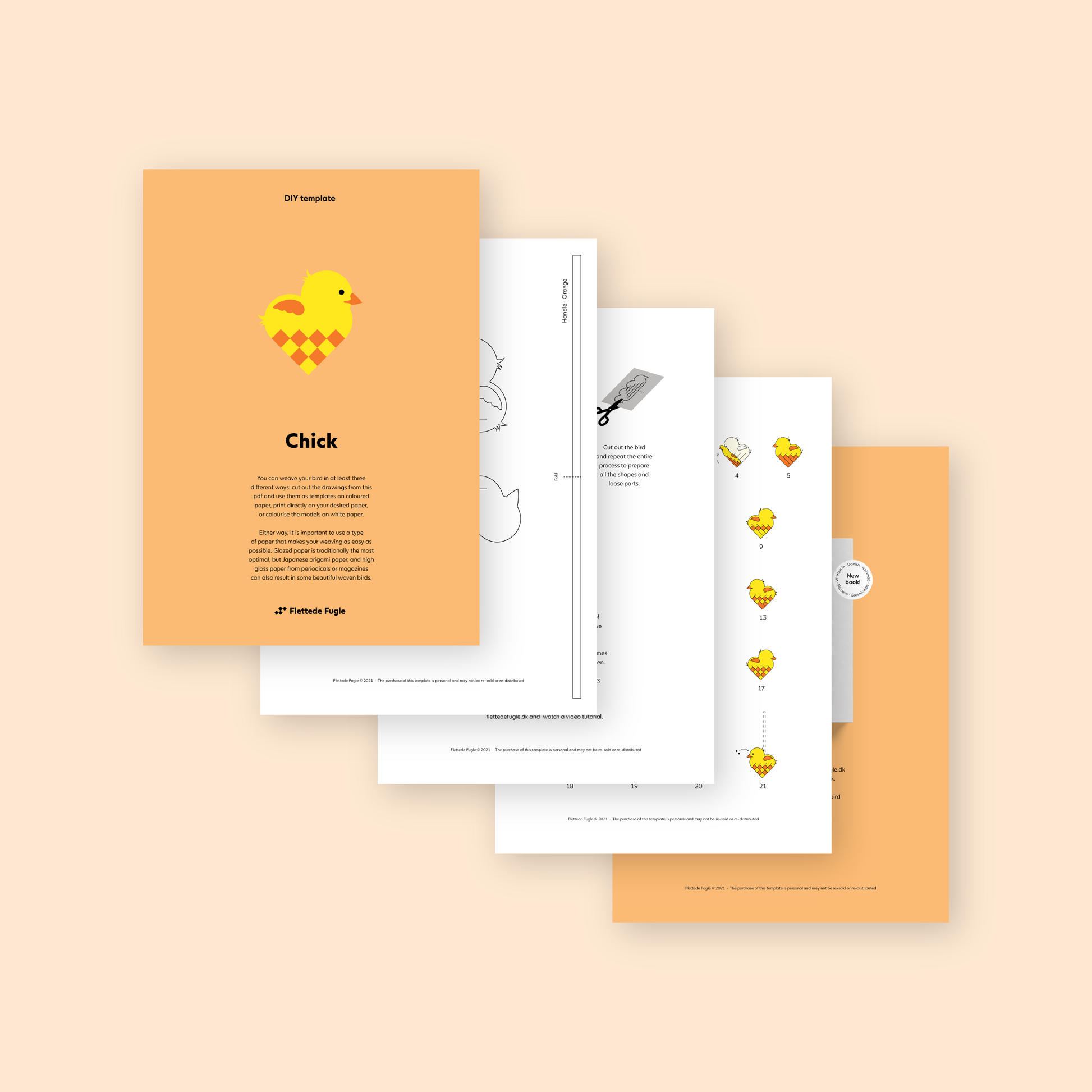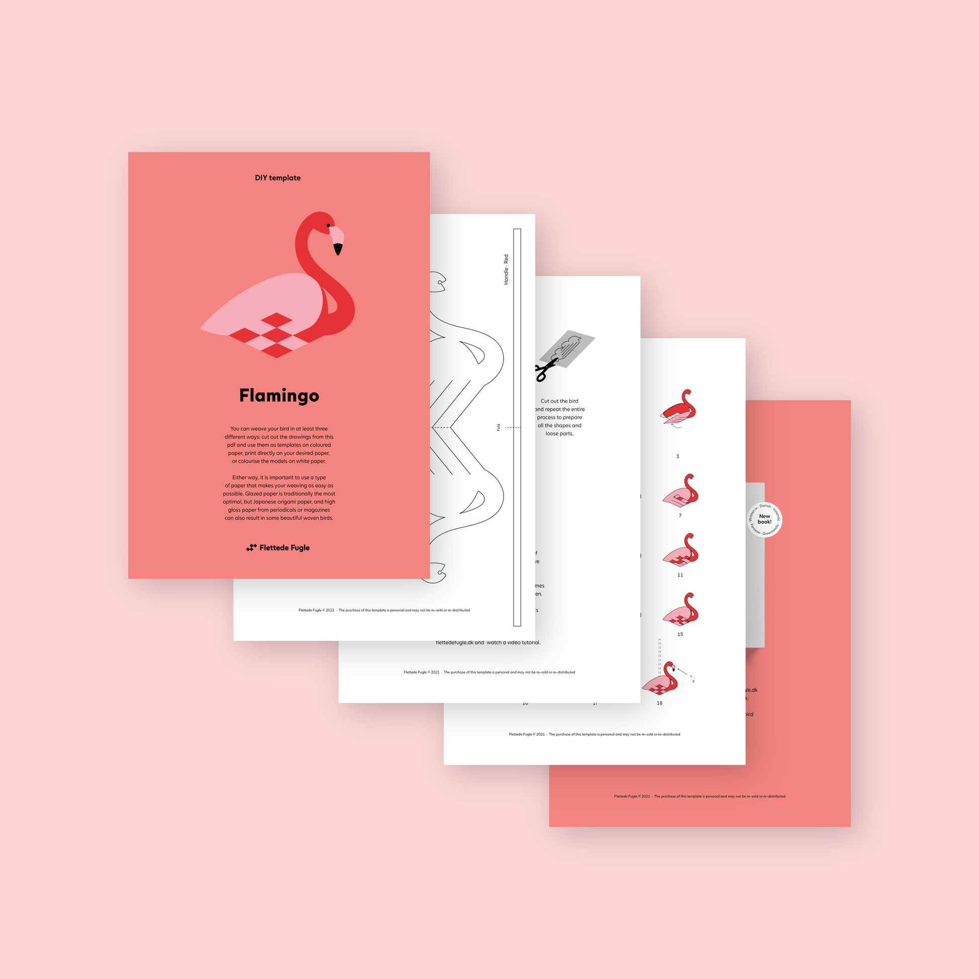 Hvis du har lyst til at prøve helt fra bunden, så kan du vælge at downloade og printe din egen skabelon. Fremgangsmåden er præcis som i bøgerne. Der er en tegning af den færdige fugl og tegninger af de enkelte løse elementer, som skal kalkes eller klippes. Foruden selve fuglen følger også en fletteanvisning med der beskriver fremgangsmåden. Vælg den fugl du ønsker at flette. Når du har gennemført købet vil du få tilsendt et download-link på mail, hvorfra du kan hente skabelonen ned.