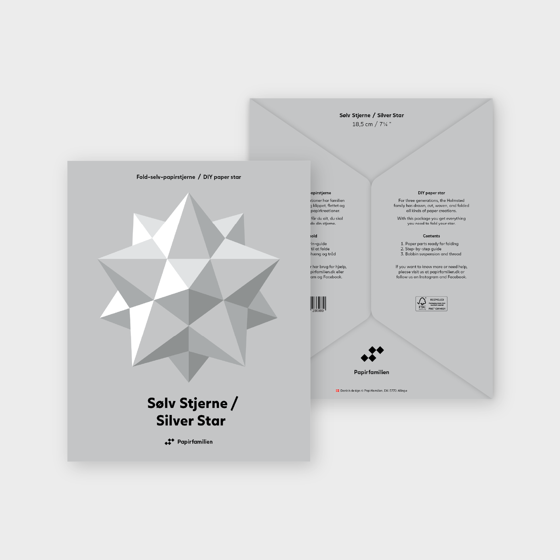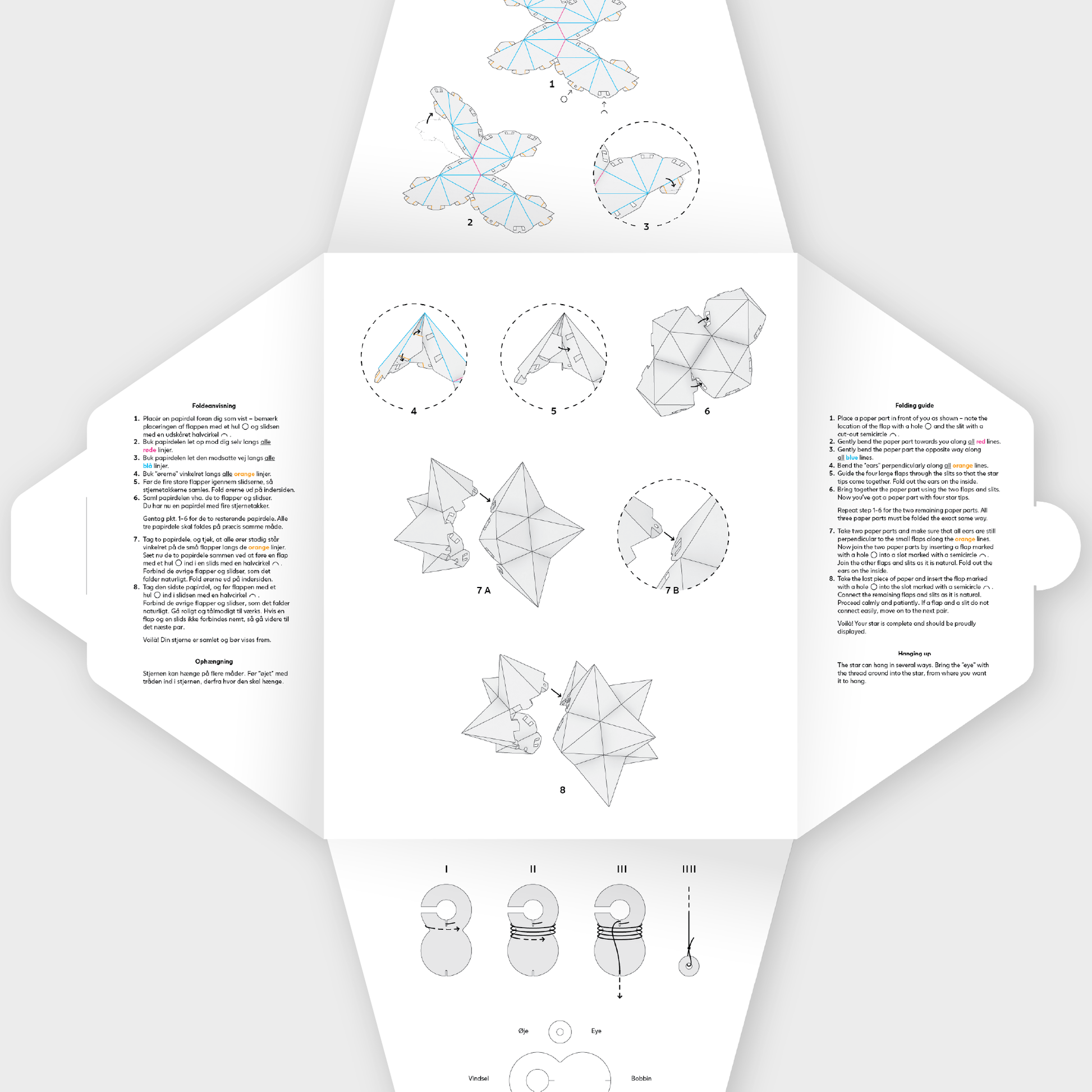 Med denne pakke får du alt, du skal bruge til at folde din stjerne. Pakken indeholder papirdele til at folde, en trin-for-trin-guide, et vindselophæng og tråd.