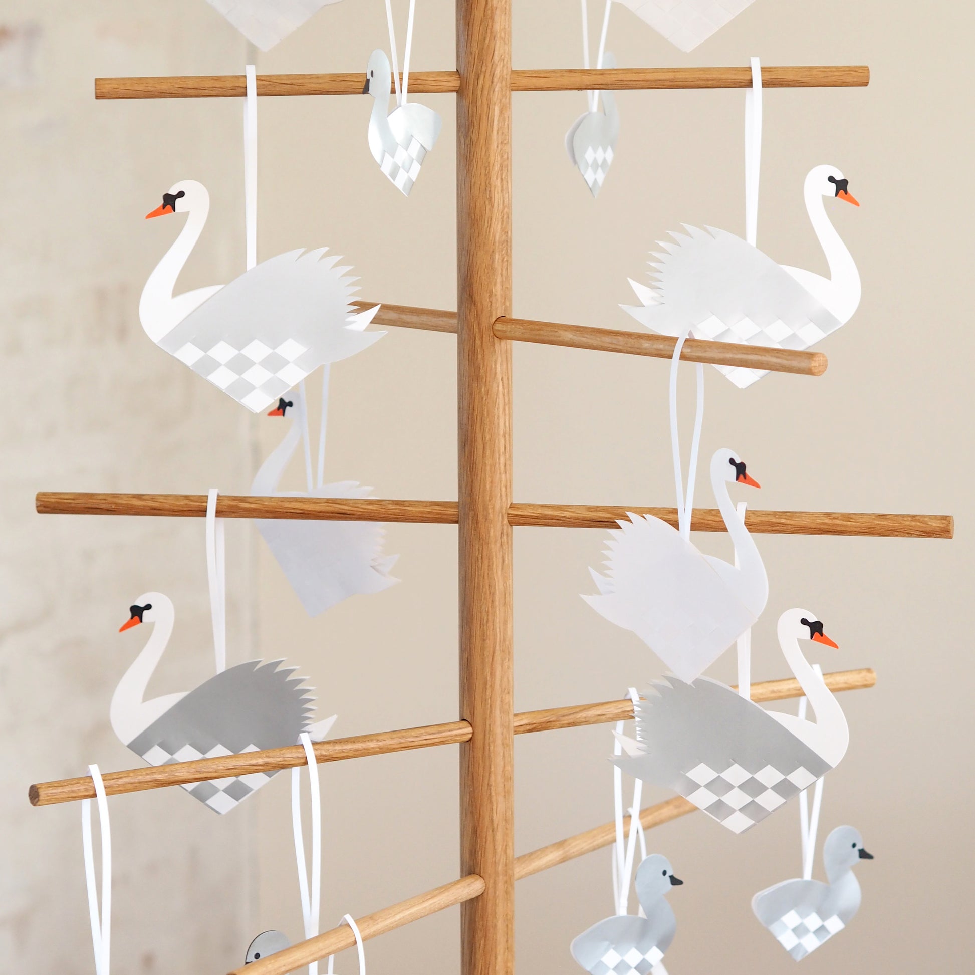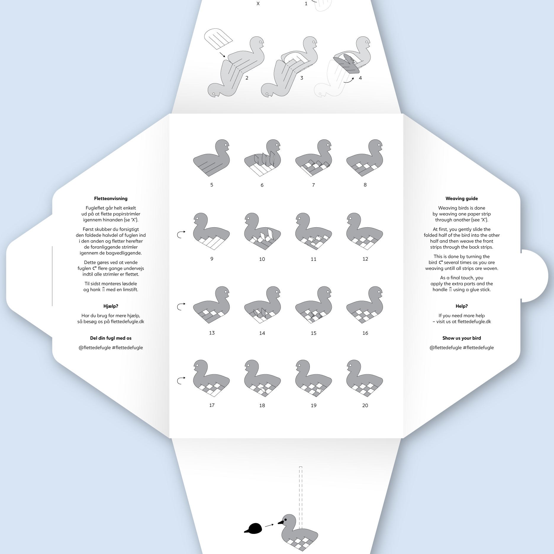 Med denne pakke får du alt, du skal bruge til at flette din fugl. Det eneste du skal finde frem er en limstift. Pakken indeholder en trin-for-trin-guide, papirdele til at flette, løsdele til montering og en hank til ophængning.
